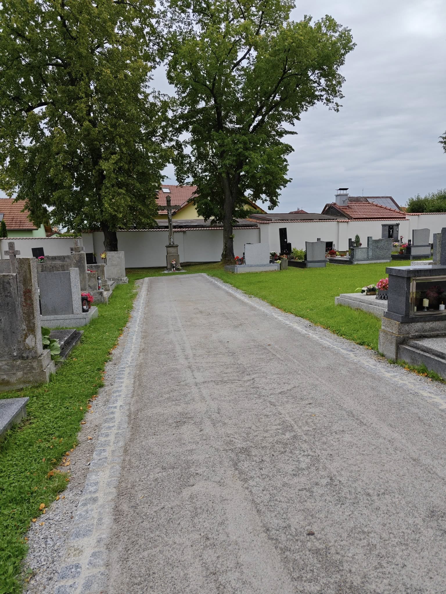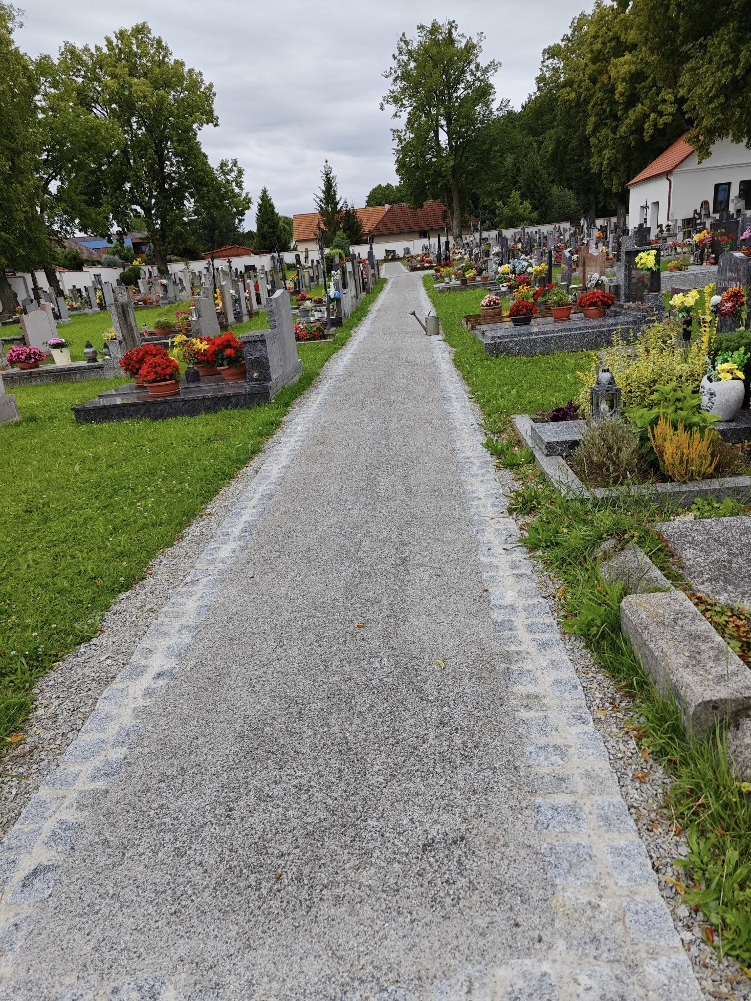 „V loňském roce jsme začali s opravami hřbitovní zdi a márnice. Práce provedla firma Precis Building SE a vyšly na 1,5 milionu korun. Jihočeský kraj nám poskytl dotaci ve výši 400 tisíc,“ uvedla starostka. Letos pak přišla na řadu přístupová cesta. Místo vyšlapaných pěšin se návštěvníci nyní mohou procházet po nových mlatových chodníčcích olemovaných kamennou kostkou, které dodávají místu upravený a přitom přírodní vzhled. Na zakázce se podíleli místní řemeslníci – stavební práce provedl Jan Kümmel a kamenické práce zajistil Zdeněk Bürger. Náklady dosáhly 480 tisíc korun.